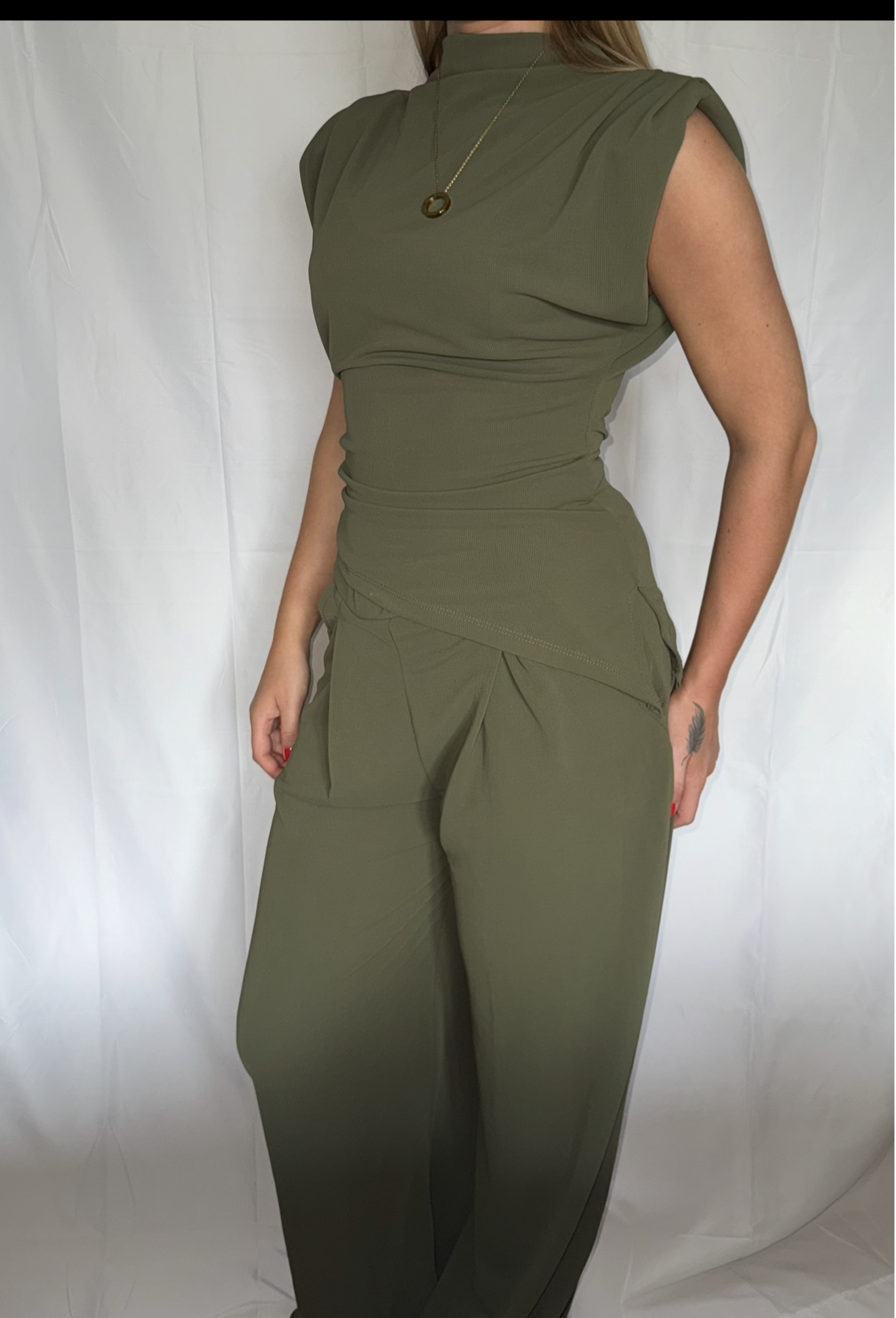 Make an effortlessly chic statement with this Kharki green two-piece co-ord set. Designed to flatter, this set includes a sleek high-neck top and matching wide-leg trousers that blend modern tailoring with comfortable wear.